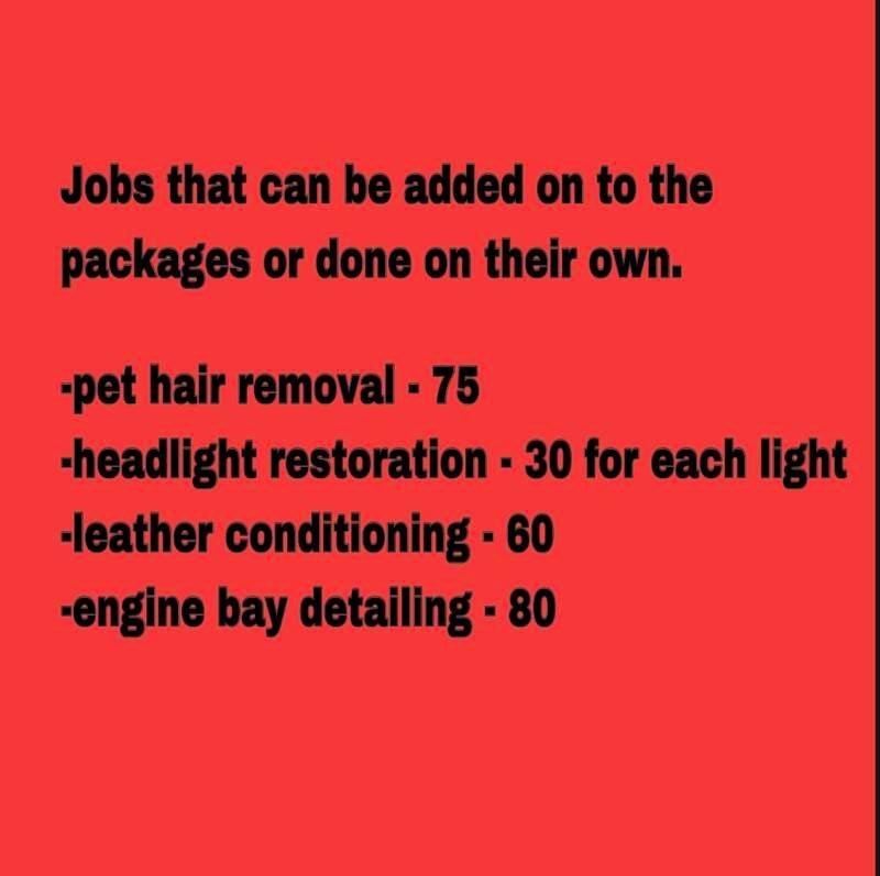 Prices are based on the size and condition of the vehicle. As such all prices listed are the starting price for service, I base this on time to clean on similar sized vehicles with an average level of dirt, soil, and stains. Once I see and can inspect the vehicle, I will give you a solid price and a full rundown before starting work.